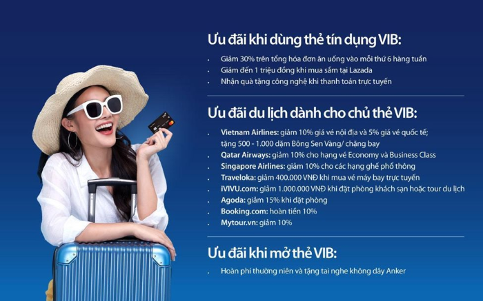Khi chi tiêu cho ăn uống tại các thương hiệu ẩm thực lớn, trong đó có hệ thống Golden Gate Group, chủ thẻ tín dụng VIB sẽ được giảm 30% trên tổng hóa đơn, áp dụng vào mỗi thứ 6 hàng tuần. Với nhu cầu du lịch, chúng tôi giúp khách hàng tiết kiệm đến 10% khi mua vé máy bay và đến 15% khi đặt phòng khách sạn hoặc tour du lịch.