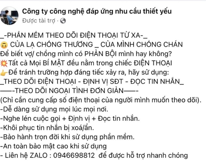 Một trang Facebook khác có tên "Công ty công nghệ đáp ứng nhu cầu thiết yếu từ xa" cũng quảng cáo dịch vụ cung cấp phần mềm theo dõi điện thoại từ xa. Trang này đưa ra mức phí sử dụng phần mềm nghe lén, đọc trộm tin nhắn trên mạng xã hội và sim điện thoại chỉ 600.000 đồng/lần, duy trì sử dụng với mức phí 230.000 đồng/tháng. Sau khi được gửi link, khách hàng nhập số điện thoại của người muốn theo dõi vào và chuyển khoản tiền phí.