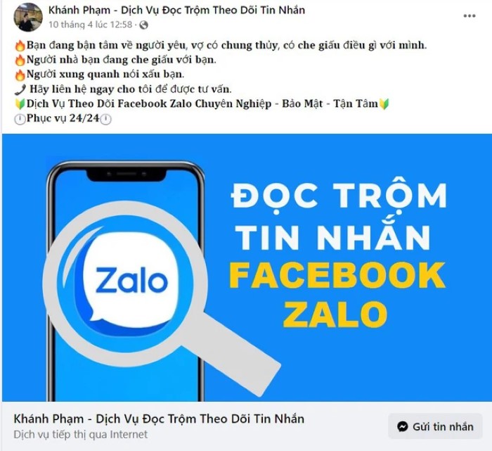 Trong vai là khách đang có nhu cầu xem tin nhắn của người khác trên Facebook và Zalo, chúng tôi liên hệ với admin của Fanpage "Dịch vụ đọc trộm theo dõi tin nhắn" và được báo giá 1 triệu đồng đối với tin nhắn Messenger và 2,5 triệu đồng đối với tin nhắn Zalo. Thời hạn sử dụng dịch vụ là cho đến khi chủ tài khoản bị đọc trộm đổi mật khẩu mới.