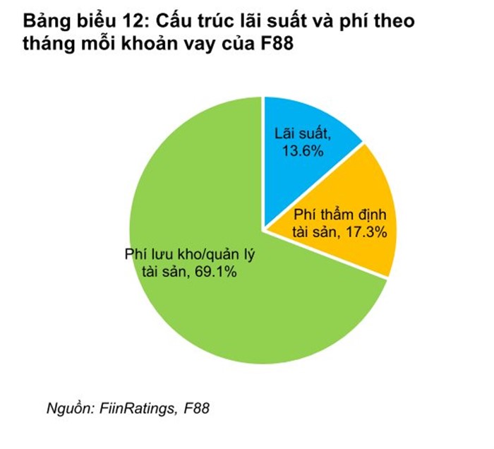 Tại F88, FiinRatings cho biết, theo báo cáo tài chính đã được kiểm toán đến cuối năm 2021, F88 đang cung cấp các khoản vay cho khách hàng với phí thẩm định khoản vay 1,4%/tháng và phí lưu kho/quản lý tài sản dao động từ 2% đến 6,5% mỗi tháng.