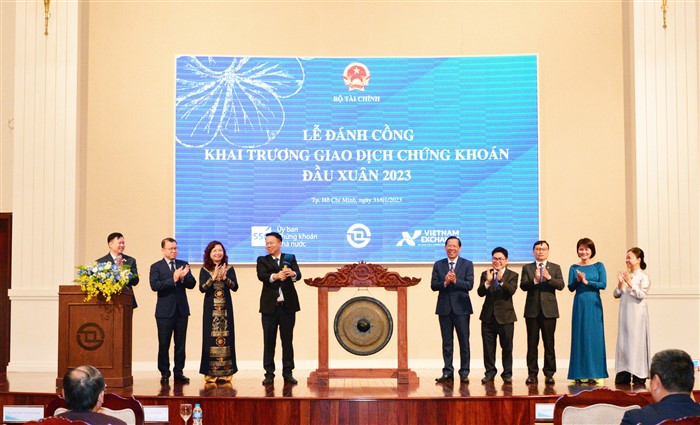 Đầu giờ sáng 31/1/2023, Bộ Tài chính đã tổ chức Lễ đánh cồng khai trương giao dịch chứng khoán đầu xuân 2023 với sự tham gia của lãnh đạo Bộ, Ủy ban Chứng khoán Nhà nước, Sở giao dịch Chứng khoán Tp.HCM, Trung tâm Lưu ký chứng khoán, các doanh nghiệp niêm yết...